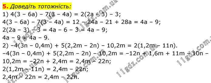Доведіть тотожність: 1) 4(3 – 6а) – 7(3 – 4а) = 2(2а – 3) – 3; 4(3 – 6а) – 7(3 – 4а) = 12 – 24а – 21 + 28а = 4а – 9; 2(2а – 3) – 3 = 4а – 6 – 3 = 4а – 9; 4а – 9 = 4а – 9. 2) –4(3n – 0,4m) + 5(2,2m – 2n) – 10,2m = 2(1,2m – 11n). –4(3n – 0,4m) + 5(2,2m – 2n) – 10,2m = –12n + 1,6m + 11m – 10n – 10,2m = –22n + 2,4m = 2,4m – 22n; 2(1,2m – 11n) = 2,4m – 22n; 2,4m – 22n = 2,4m – 22n.