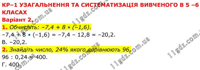 КР–1 УЗАГАЛЬНЕННЯ TA СИСТЕМАТИЗАЦІЯ ВИВЧЕНОГО В 5 –6 КЛАСАХ Варіант 2. 1. Обчисліть: –7,4 + 8 • (–1,6). –7,4 + 8 • (–1,6) = –7,4 – 12,8 = –20,2. В. –20,2. 2. Знайдіть число, 24% якого дорівнюють 96. 96 : 0,24 = 400. Г. 400.