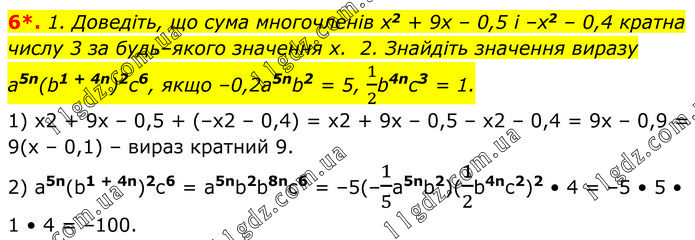 1. Доведіть, що сума многочленів х2 + 9х – 0,5 і –х2 – 0,4 кратна числу 3 за будь–якого значення х. 2. Знайдіть значення виразу а5n(b1 + 4n)2с6, якщо –0,2а5nb2 = 5, 1/2b4nc3 = 1. 1) x2 + 9x – 0,5 + (–x2 – 0,4) = x2 + 9x – 0,5 – x2 – 0,4 = 9x – 0,9 = 9(x – 0,1) – вираз кратний 9. 2) а5n(b1 + 4n)2с6 = а5nb2b8nс6 = –5(–1/5а5nb2)(1/2b4nс2)2 • 4 = –5 • 5 • 1 • 4 = –100.
