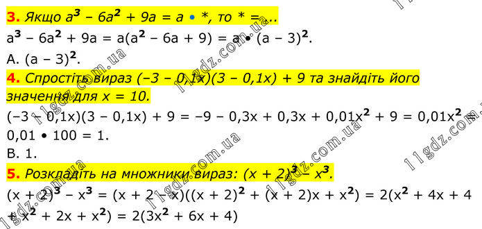3. Якщо а3 – 6а2 + 9а = а • *, то * = ... а3 – 6а2 + 9а = а(а2 – 6а + 9) = а • (а – 3)2. А. (а – З)2. 4. Спростіть вираз (–3 – 0,1х)(3 – 0,1x) + 9 та знайдіть його значення для х = 10. (–3 – 0,1х)(3 – 0,1x) + 9 = –9 – 0,3х + 0,3х + 0,01х2 + 9 = 0,01х2 = 0,01 • 100 = 1. В. 1. 5. Розкладіть на множники вираз: (х + 2)3 – х3. (х + 2)3 – х3 = (х + 2 – х)((х + 2)2 + (х + 2)х + х2) = 2(х2 + 4х + 4 + х2 + 2х + х2) = 2(3х2 + 6х + 4)