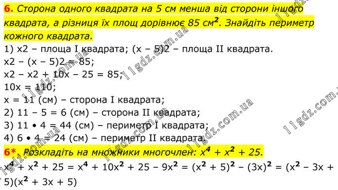 6. Сторона одного квадрата на 5 см менша від сторони іншого квадрата, а різниця їх площ дорівнює 85 см2. Знайдіть периметр кожного квадрата. 1) х2 – площа І квадрата; (х – 5)2 – площа ІІ квадрата. х2 – (х – 5)2 = 85; х2 – х2 + 10х – 25 = 85; 10х = 110; х = 11 (см) – сторона І квадрата; 2) 11 – 5 = 6 (см) – сторона ІІ квадрата; 3) 11 • 4 = 44 (см) – периметр І квадрата; 4) 6 • 4 = 24 (см) – периметр ІІ квадрата. 6*. Розкладіть на множники многочлен: х4 + х2 + 25. х4 + х2 + 25 = х4 + 10х2 + 25 – 9х2 = (х2 + 5)2 – (3х)2 = (х2 – 3х + 5)(х2 + 3х + 5)
