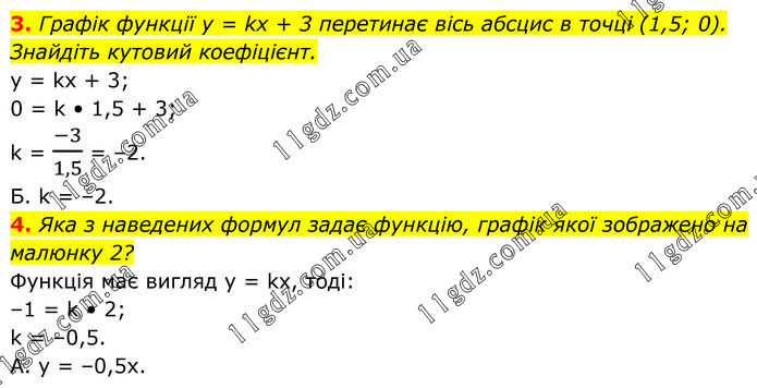 3. Графік функції у = kx + 3 перетинає вісь абсцис в точці (1,5; 0). Знайдіть кутовий коефіцієнт. y = kx + 3; 0 = k • 1,5 + 3; k = (-3)/1,5 = –2. Б. k = –2. 4. Яка з наведених формул задає функцію, графік якої зображено на малюнку 2? Функція має вигляд у = kх, тоді: –1 = k • 2; k = –0,5. А. у = –0,5х.
