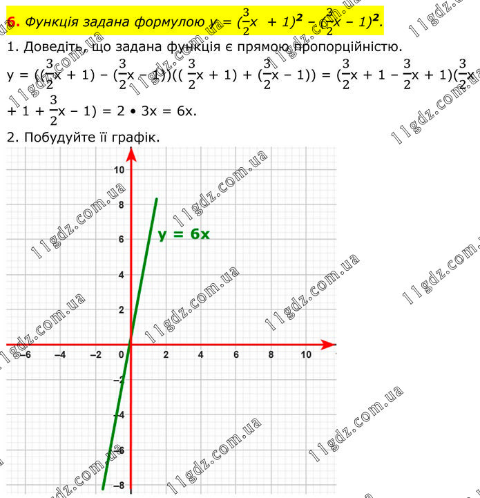 Функція задана формулою у = (3/2х + 1)2 – (3/2х – 1)2. 1. Доведіть, що задана функція є прямою пропорційністю. у = ((3/2х + 1) – (3/2х – 1))(( 3/2х + 1) + (3/2х – 1)) = (3/2х + 1 – 3/2х + 1)(3/2х + 1 + 3/2х – 1) = 2 • 3х = 6х. 2. Побудуйте її графік.