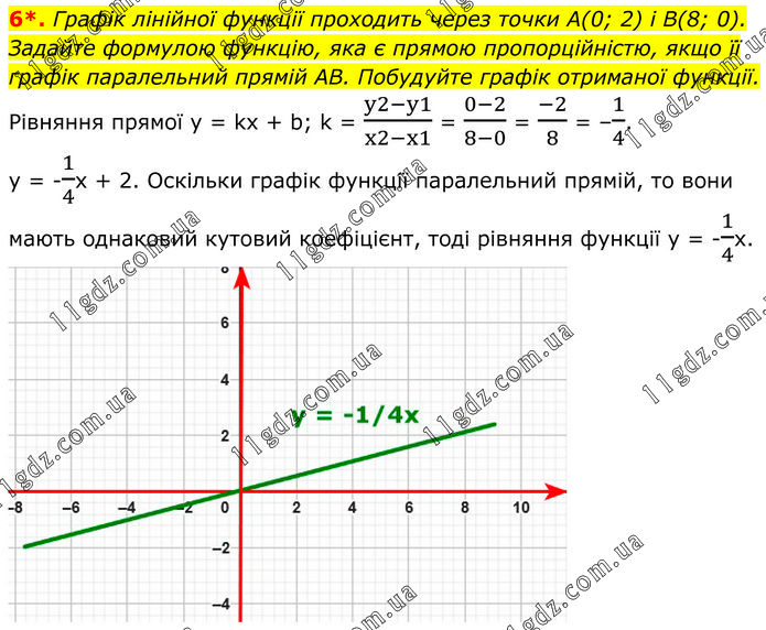 Графік лінійної функції проходить через точки А(0; 2) і В(8; 0). Задайте формулою функцію, яка є прямою пропорційністю, якщо її графік паралельний прямій AB. Побудуйте графік отриманої функції. Рівняння прямої y = kx + b; k = (y2-y1)/(x2-x1) = (0-2)/(8-0) = (-2)/8 = –1/4. y = –1/4x + 2. Оскільки графік функції паралельний прямій, то вони мають однаковий кутовий коефіцієнт, тоді рівняння функції у = –1/4х.