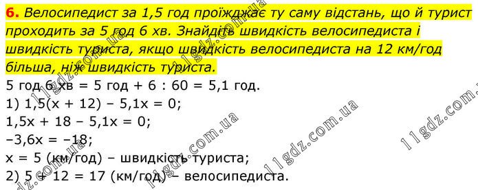 Велосипедист за 1,5 год проїжджає ту саму відстань, що й турист проходить за 5 год 6 хв. Знайдіть швидкість велосипедиста і швидкість туриста, якщо швидкість велосипедиста на 12 км/год більша, ніж швидкість туриста. 5 год 6 хв = 5 год + 6 : 60 = 5,1 год. 1) 1,5(х + 12) – 5,1х = 0; 1,5х + 18 – 5,1х = 0; –3,6х = –18; х = 5 (км/год) – швидкість туриста; 2) 5 + 12 = 17 (км/год) – велосипедиста.