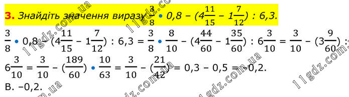 3. Знайдіть значення виразу 3/8 • 0,8 – (411/15 – 17/12) : 6,3. 3/8 • 0,8 – (411/15 – 17/12) : 6,3 = 3/8 • 8/10 – (444/60 – 135/60) : 63/10 = 3/10 – (39/60) : 63/10 = 3/10 – (189/60) • 10/63 = 3/10 – (21/42) = 0,3 – 0,5 = –0,2. В. –0,2.