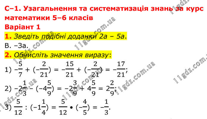 С–1. Узагальнення та систематизація знань за курс математики 5–6 класів Варіант 1 1. Зведіть подібні доданки 2а – 5а. В. –За. 2. Обчисліть значення виразу: 1) –5/7 + (–2/21) = –15/21 + (–2/21) = –17/21; 2) –21/3 – (–45/9) = –23/9 + 45/9 = 22/9; 3) 5/12 : (–11/4) = 5/12 • (–4/5) = –1/3.