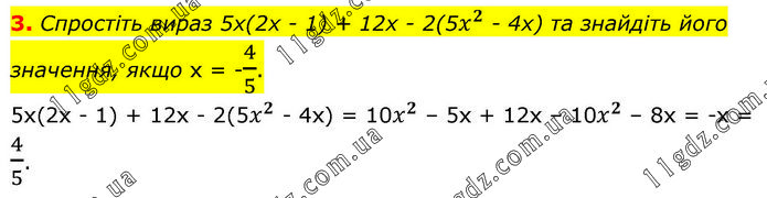 3. Спростіть вираз 5х(2х - 1) + 12х - 2(5x^2 - 4х) та знайдіть його значення, якщо х = -4/5. 5х(2х - 1) + 12х - 2(5x^2 - 4х) = 10x^2 – 5x + 12x – 10x^2 – 8x = -x = 4/5.