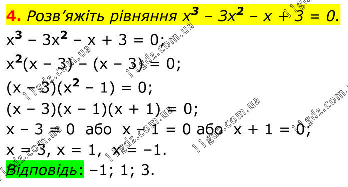 4. Розв’яжіть рівняння х3 – Зх2 – х + 3 = 0. x3 – 3x2 – x + 3 = 0; x2(x – 3) – (x – 3) = 0; (x – 3)(x2 – 1) = 0; (x – 3)(x – 1)(x + 1) = 0; x – 3 = 0 або x – 1 = 0 або x + 1 = 0; x = 3, x = 1, x = –1. Відповідь: –1; 1; 3.