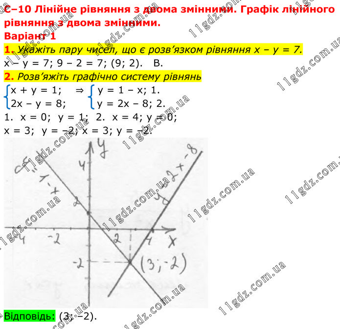 С–10 Лінійне рівняння з двома змінними. Графік лінійного рівняння з двома змінними. Варіант 1 1. Укажіть пару чисел, що є розв’язком рівняння х – у = 7. x – y = 7; 9 – 2 = 7; (9; 2). B. 2. Розв’яжіть графічно систему рівнянь
