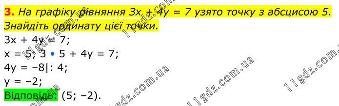 На графіку рівняння Зх + 4у = 7 узято точку з абсцисою 5. Знайдіть ординату цієї точки. 3x + 4y = 7; x = 5; 3 • 5 + 4y = 7; 4y = –8|: 4; y = –2; Відповідь: (5; –2).