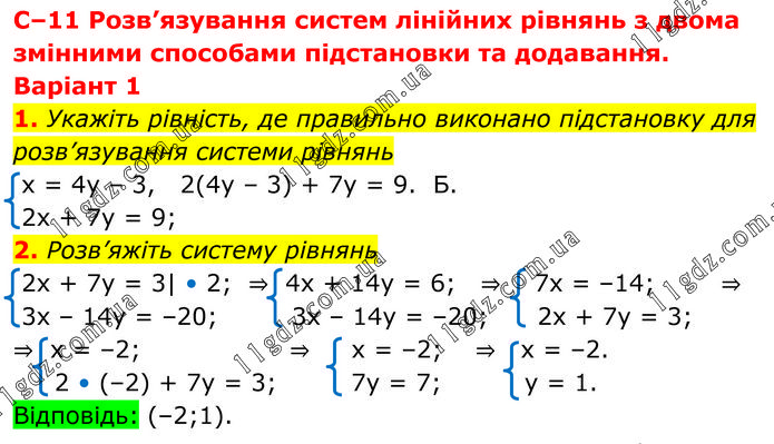 C–11 Розв’язування систем лінійних рівнянь з двома змінними способами підстановки та додавання. Варіант 1 1. Укажіть рівність, де правильно виконано підстановку для розв’язування системи рівнянь x = 4y – 3, 2(4y – 3) + 7y = 9. Б. 2x + 7y = 9; 2. Розв’яжіть систему рівнянь