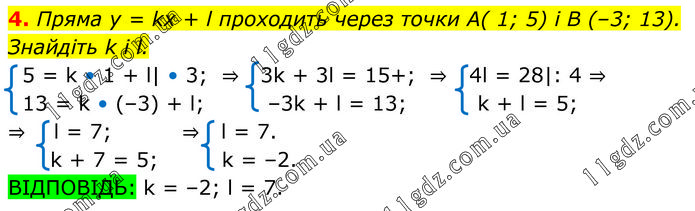 Пряма у = kх + l проходить через точки А( 1; 5) і В (–3; 13). Знайдіть k i l.