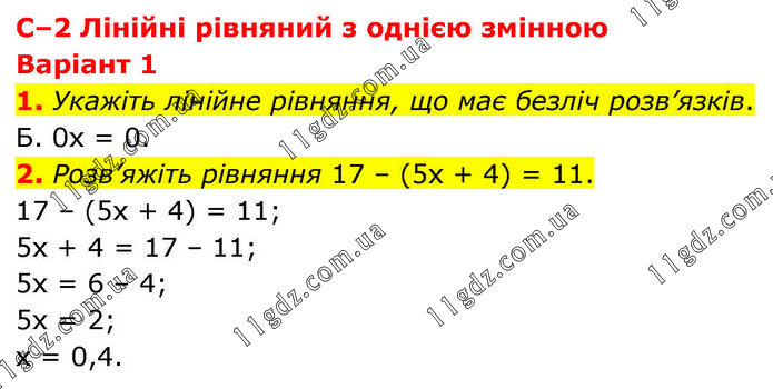 С–2 Лінійні рівняний з однією змінною Варіант 1 1. Укажіть лінійне рівняння, що має безліч розв’язків. Б. 0x = 0. 2. Розв’яжіть рівняння 17 – (5х + 4) = 11. 17 – (5х + 4) = 11; 5х + 4 = 17 – 11; 5х = 6 – 4; 5х = 2; х = 0,4.