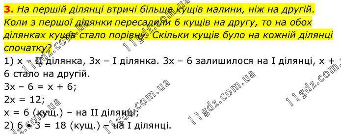 На першій ділянці втричі більше кущів малини, ніж на другій. Коли з першої ділянки пересадили 6 кущів на другу, то на обох ділянках кущів стало порівну. Скільки кущів було на кожній ділянці спочатку? 1) х – ІІ ділянка, 3х – І ділянка. 3х – 6 залишилося на І ділянці, х + 6 стало на другій. 3х – 6 = х + 6; 2х = 12; х = 6 (кущ.) – на ІІ ділянці; 2) 6 • 3 = 18 (кущ.) – на І ділянці.