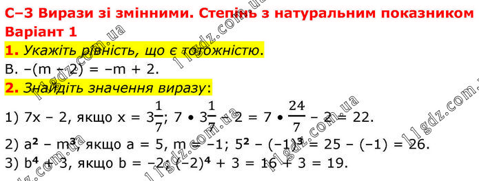 С–3 Вирази зі змінними. Степінь з натуральним показником Варіант 1 1. Укажіть рівність, що є тотожністю. B. –(m – 2) = –m + 2. 2. Знайдіть значення виразу: 1) 7x – 2, якщо х = 31/7; 7 • 31/7 – 2 = 7 • 24/7 – 2 = 22. 2) а2 – m3, якщо а = 5, m = –1; 52 – (–1)3 = 25 – (–1) = 26. 3) b4 + 3, якщо b = –2; (–2)4 + 3 = 16 + 3 = 19.