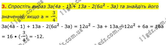 3. Спростіть вираз За(4а - 1) + 13а - 2(6a^2 - За) та знайдіть його значення, якщо а = -3/4. За(4а - 1) + 13а - 2(6a^2 - За) = 12a^2 – 3a + 13a – 12a^2 + 6a = 16a = 16 • (-3/4) = -12.