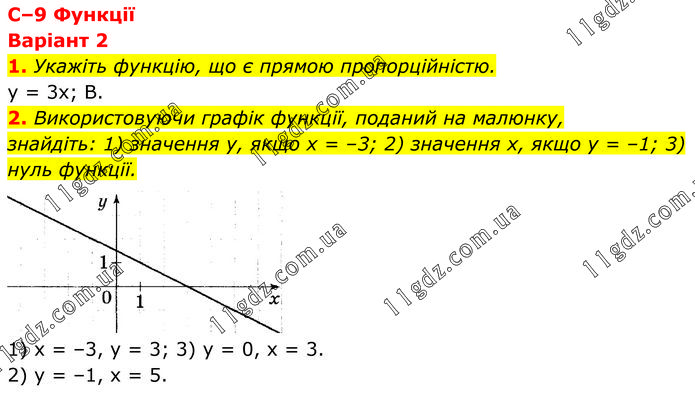 C–9 Функції Варіант 2 1. Укажіть функцію, що є прямою пропорційністю. y = 3x; B. 2. Використовуючи графік функції, поданий на малюнку, знайдіть: 1) значення у, якщо х = –3; 2) значення х, якщо у = –1; 3) нуль функції. 1) x = –3, y = 3; 3) y = 0, x = 3. 2) y = –1, x = 5.