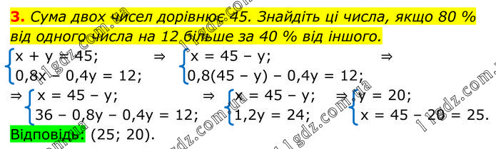 Сума двох чисел дорівнює 45. Знайдіть ці числа, якщо 80 % від одного числа на 12 більше за 40 % від іншого.