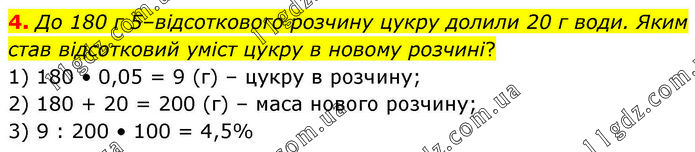 4. До 180 г 5–відсоткового розчину цукру долили 20 г води. Яким став відсотковий уміст цукру в новому розчині? 1) 180 • 0,05 = 9 (г) – цукру в розчину; 2) 180 + 20 = 200 (г) – маса нового розчину; 3) 9 : 200 • 100 = 4,5%