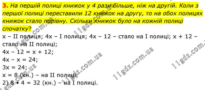3. На першій полиці книжок у 4 рази більше, ніж на другій. Коли з першої полиці переставили 12 книжок на другу, то на обох полицях книжок стало порівну. Скільки книжок було на кожній полиці спочатку? х – ІІ полиця; 4х – І полиця; 4х – 12 – стало на І полиці; х + 12 – стало на ІІ полиці; 4х – 12 = х + 12; 4х – х = 24; 3х = 24; х = 8 (кн.) – на ІІ полиці; 2) 8 • 4 = 32 (кн.) – на І полиці.
