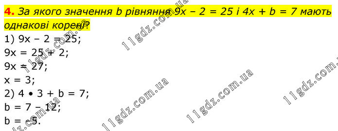 4. За якого значення b рівняння 9х – 2 = 25 і 4х + b = 7 мають однакові корені? 1) 9х – 2 = 25; 9х = 25 + 2; 9х = 27; х = 3; 2) 4 • 3 + b = 7; b = 7 – 12; b = –5.