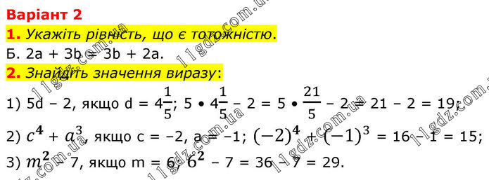 Варіант 2 1. Укажіть рівність, що є тотожністю. Б. 2а + Зb = 3b + 2а. 2. Знайдіть значення виразу: 1) 5d – 2, якщо d = 41/5; 5 • 41/5 – 2 = 5 • 21/5 – 2 = 21 – 2 = 19; 2) c^4 + a^3, якщо с = –2, а = –1; 〖(-2)〗^4 + 〖(-1)〗^3 = 16 – 1 = 15; 3) m^2 – 7, якщо m = 6; 6^2 – 7 = 36 – 7 = 29.