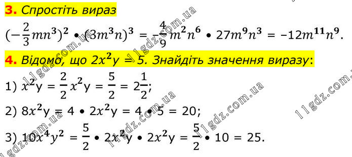 3. Спростіть вираз 〖(-2/3 〖mn〗^3)〗^2 • 〖(3m^3 n)〗^3 = –4/9 m^2 n^6 • 27m^9 n^3 = –12m^11 n^9. 4. Відомо, що 2x^2у = 5. Знайдіть значення виразу: 1) x^2у = 2/2 x^2у = 5/2 = 21/2; 2) 8x^2у = 4 • 2x^2у = 4 • 5 = 20; 3) 10x^4 y^2 = 5/2 • 2x^2у • 2x^2у = 5/2 • 10 = 25.