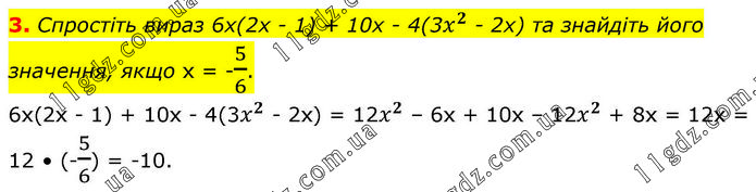3. Спростіть вираз 6х(2х - 1) + 10x - 4(3x^2 - 2х) та знайдіть його значення, якщо х = -5/6. 6х(2х - 1) + 10x - 4(3x^2 - 2х) = 12x^2 – 6x + 10x – 12x^2 + 8x = 12x = 12 • (-5/6) = -10.