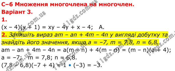 С–6 Множення многочлена на многочлен. Варіант 3. 1. (x – 4)(y + 1) = xy – 4y + x – 4; A. 2. Запишіть вираз аm – аn + 4m – 4n у вигляді добутку та знайдіть його значення, якщо а = –7, m = 7,8, n = 6,8. am – an + 4m – 4n = a(m – n) + 4(m – n) = (m – n)(a + 4); a = –7; m = 7,8; n = 6,8. (7,8 – 6,8)(–7 + 4) = 1 • (–3) = –3.