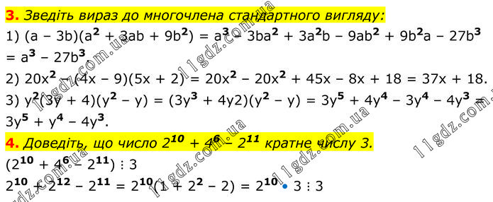 3. Зведіть вираз до многочлена стандартного вигляду: 1) (a – 3b)(a2 + 3ab + 9b2) = a3 – 3ba2 + 3a2b – 9ab2 + 9b2a – 27b3 = a3 – 27b3. 2) 20x2 – (4x – 9)(5x + 2) = 20x2 – 20x2 + 45x – 8x + 18 = 37x + 18. 3) y2(3y + 4)(y2 – y) = (3y3 + 4y2)(y2 – y) = 3y5 + 4y4 – 3y4 – 4y3 = 3y5 + y4 – 4y3. 4. Доведіть, що число 210 + 46 – 211 кратне числу 3. (210 + 46 – 211) ⋮ 3 210 + 212 – 211 = 210(1 + 22 – 2) = 210 • 3 ⋮ 3