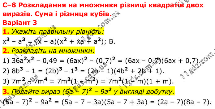 C–8 Розкладання на множники різниці квадратів двох виразів. Сума і різниця кубів. Варіант 3 1. Укажіть правильну рівність: x3 – a3 = (x – a)(x2 + xa + a2); B. 2. Розкладіть на множники: 1) 36a2x2 – 0,49 = (6ax)2 – (0,7)2 = (6ax – 0,7)(6ax + 0,7). 2) 8b3 – 1 = (2b)3 – 13 = (2b – 1)(4b2 + 2b + 1). 3) 7m2 – 7m4 = 7m2(1 – m2) = 7m2(1 – m)(1 + m). 3. Подайте вираз (5а – 7)2 – 9а2 у вигляді добутку. (5a – 7)2 – 9a2 = (5a – 7 – 3a)(5a – 7 + 3a) = (2a – 7)(8a – 7).