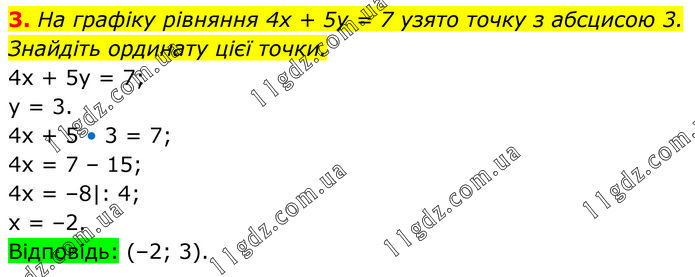 На графіку рівняння 4х + 5у = 7 узято точку з абсцисою 3. Знайдіть ординату цієї точки. 4x + 5y = 7; y = 3. 4x + 5 • 3 = 7; 4x = 7 – 15; 4x = –8|: 4; x = –2. Відповідь: (–2; 3).