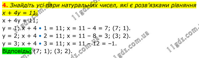 Знайдіть усі пари натуральних чисел, які є розв’язками рівняння х + 4у = 11. x + 4y = 11; y = 1; x + 4 • 1 = 11; x = 11 – 4 = 7; (7; 1). y = 2; x + 4 • 2 = 11; x = 11 – 8 = 3; (3; 2). y = 3; x + 4 • 3 = 11; x = 11 – 12 = –1. Відповідь: (7; 1); (3; 2).