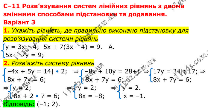 C–11 Розв’язування систем лінійних рівнянь з двома змінними способами підстановки та додавання. Варіант 3 1. Укажіть рівність, де правильно виконано підстановку для розв’язування системи рівнянь y = 3x – 4; 5x + 7(3x – 4) = 9. A. 5x + 7y = 9; 2. Розв’яжіть систему рівнянь