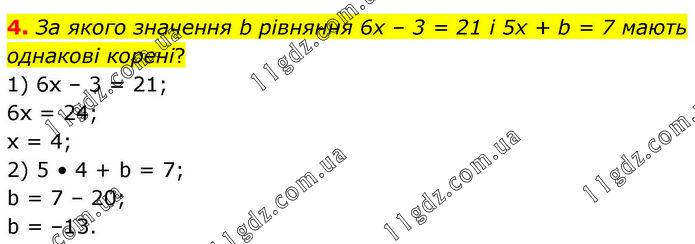 4. За якого значення b рівняння 6х – 3 = 21 і 5х + b = 7 мають однакові корені? 1) 6х – 3 = 21; 6х = 24; х = 4; 2) 5 • 4 + b = 7; b = 7 – 20; b = –13.