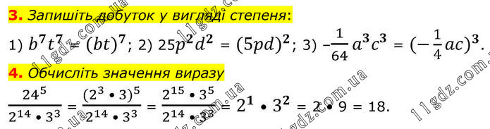 3. Запишіть добуток у вигляді степеня: 1) b^7 t^7 = 〖(bt)〗^7; 2) 25p^2 d^2 = 〖(5pd)〗^2; 3) –1/64 a^3 c^3 = 〖(-1/4 ac)〗^3. 4. Обчисліть значення виразу 24^5/(2^14 • 3^3 ) = 〖(2^3 • 3)〗^5/(2^14 • 3^3 ) = (2^15 • 3^5)/〖2^14 • 3〗^3 = 2^1 • 3^2 = 2 • 9 = 18.