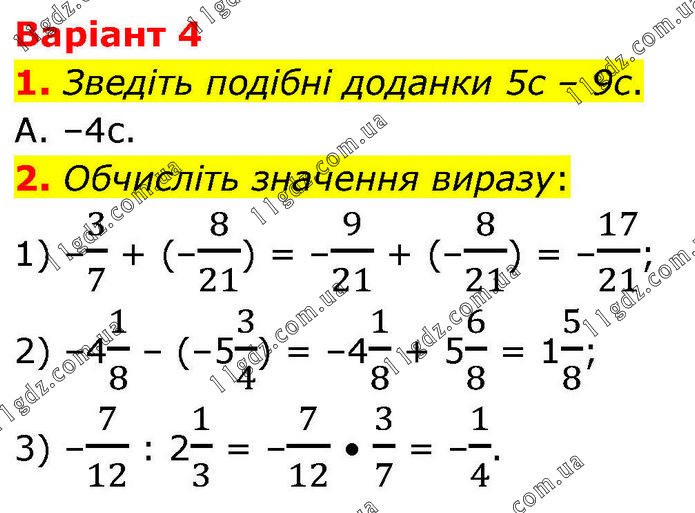 Варіант 4 1. Зведіть подібні доданки 5с – 9с. А. –4c. 2. Обчисліть значення виразу: 1) –3/7 + (–8/21) = –9/21 + (–8/21) = –17/21; 2) –41/8 – (–53/4) = –41/8 + 56/8 = 15/8; 3) –7/12 : 21/3 = –7/12 • 3/7 = –1/4.