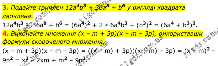 3. Подайте тричлен 12а4b3 + 36а8 + b6 у вигляді квадрата двочлена. 12a4b3 + 36a8 + b6 = (6a4)2 + 2 • 6a4b3 + (b3)2 = (6a4 + b3)2. 4. Виконайте множення (х – m + 3р)(х – m – 3р), використавши формули скороченого множення. (x – m + 3p)(x – m – 3p) = ((x – m) + 3p)((x – m) – 3p) = (x – m)2 – 9p2 = x2 – 2xm + m2 – 9p2.