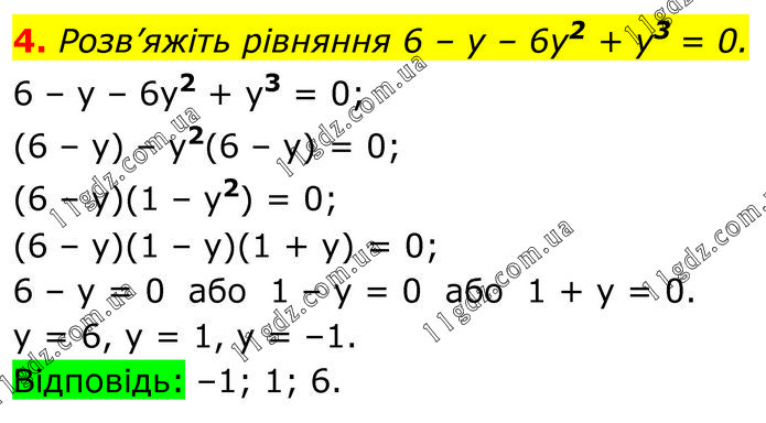 4. Розв’яжіть рівняння 6 – y – 6у2 + у3 = 0. 6 – y – 6y2 + y3 = 0; (6 – y) – y2(6 – y) = 0; (6 – y)(1 – y2) = 0; (6 – y)(1 – y)(1 + y) = 0; 6 – y = 0 або 1 – у = 0 або 1 + у = 0. у = 6, у = 1, у = –1. Відповідь: –1; 1; 6.