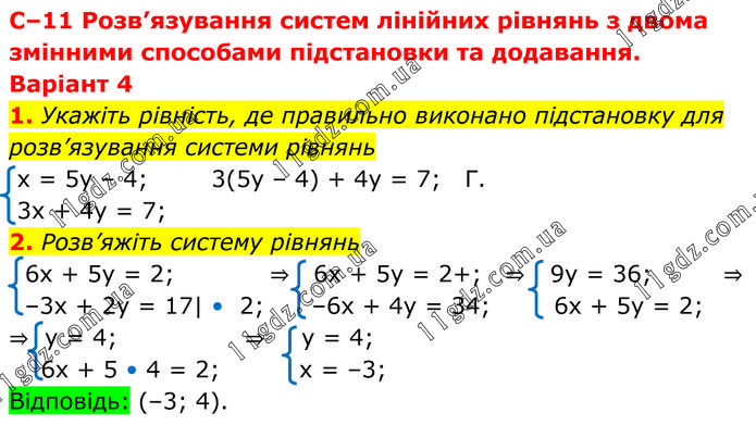 C–11 Розв’язування систем лінійних рівнянь з двома змінними способами підстановки та додавання. Варіант 4 1. Укажіть рівність, де правильно виконано підстановку для розв’язування системи рівнянь x = 5y – 4; 3(5y – 4) + 4y = 7; Г. 3x + 4y = 7; 2. Розв’яжіть систему рівнянь