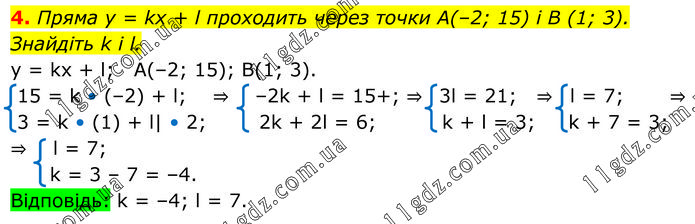 Пряма у = kх + l проходить через точки А(–2; 15) і В (1; 3). Знайдіть k i l.
