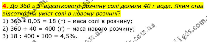 4. До 360 г 5–відсоткового розчину солі долили 40 г води. Яким став відсотковий уміст солі в новому розчині? 1) 360 • 0,05 = 18 (г) – маса солі в розчину; 2) 360 + 40 = 400 (г) – маса нового розчину; 3) 18 : 400 • 100 = 4,5%.