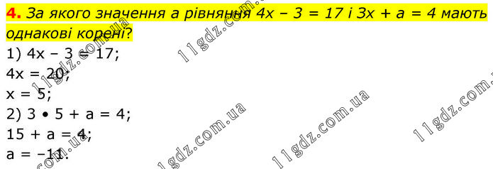 4. За якого значення а рівняння 4х – 3 = 17 і Зх + а = 4 мають однакові корені? 1) 4х – 3 = 17; 4х = 20; х = 5; 2) 3 • 5 + а = 4; 15 + а = 4; а = –11.
