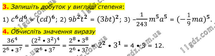 3. Запишіть добуток у вигляді степеня: 1) c^6 d^6 = 〖(cd)〗^6; 2) 9b^2 t^2 = 〖(3bt)〗^2; 3) –1/243 m^5 a^5 = 〖(-1/9 ma)〗^5. 4. Обчисліть значення виразу 36^4/(2^6 • 3^7 ) = 〖(2^2 • 3^2)〗^4/(2^6 • 3^7 ) = (2^8 • 3^8)/〖2^6 • 3〗^7 = 2^2 • 3^1 = 4 • 3 = 12.