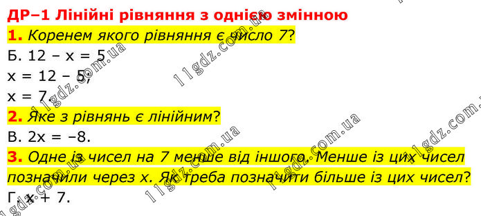 ДР–1 Лінійні рівняння з однією змінною 1. Коренем якого рівняння є число 7? Б. 12 – х = 5 х = 12 – 5; х = 7. 2. Яке з рівнянь є лінійним? B. 2х = –8. 3. Одне із чисел на 7 менше від іншого. Менше із цих чисел позначили через х. Як треба позначити більше із цих чисел? Г. х + 7.