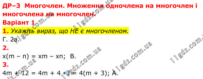 ДР–3 Многочлен. Множення одночлена на многочлен і многочлена на многочлен. Варіант 1 1. Укажіть вираз, що НЕ є многочленом. Г. 2а. 2. x(m – n) = xm – xn; B. 3. 4m + 12 = 4m + 4 •3 = 4(m + 3); A.