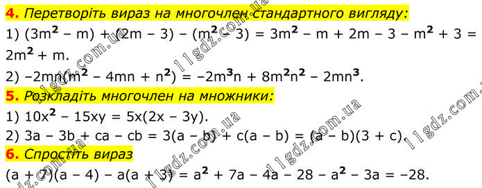 4. Перетворіть вираз на многочлен стандартного вигляду: 1) (3m2 – m) + (2m – 3) – (m2 – 3) = 3m2 – m + 2m – 3 – m2 + 3 = 2m2 + m. 2) –2mn(m2 – 4mn + n2) = –2m3n + 8m2n2 – 2mn3. 5. Розкладіть многочлен на множники: 1) 10x2 – 15xy = 5x(2x – 3y). 2) 3a – 3b + ca – cb = 3(a – b) + c(a – b) = (a – b)(3 + c). 6. Спростіть вираз (a + 7)(a – 4) – a(a + 3) = a2 + 7a – 4a – 28 – a2 – 3a = –28.