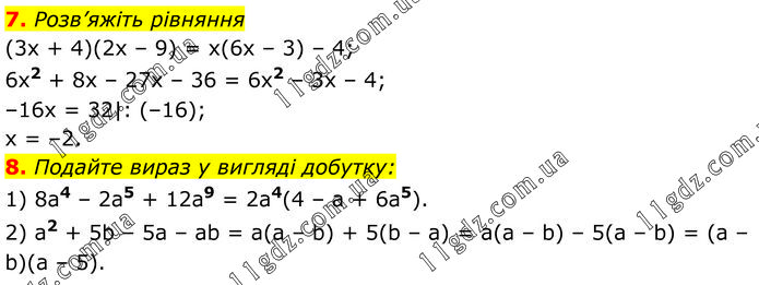 7. Розв’яжіть рівняння (3x + 4)(2x – 9) = x(6x – 3) – 4; 6x2 + 8x – 27x – 36 = 6x2 – 3x – 4; –16x = 32|: (–16); x = –2. 8. Подайте вираз у вигляді добутку: 1) 8a4 – 2a5 + 12a9 = 2a4(4 – a + 6a5). 2) a2 + 5b – 5a – ab = a(a – b) + 5(b – a) = a(a – b) – 5(a – b) = (a – b)(a – 5).