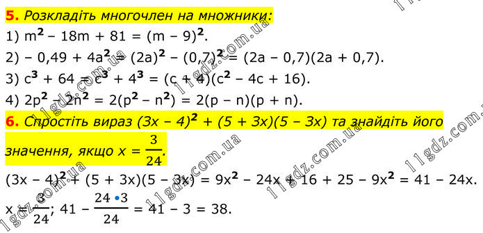 5. Розкладіть многочлен на множники: 1) m2 – 18m + 81 = (m – 9)2. 2) – 0,49 + 4a2 = (2a)2 – (0,7)2 = (2a – 0,7)(2a + 0,7). 3) c3 + 64 = c3 + 43 = (c + 4)(c2 – 4c + 16). 4) 2p2 – 2n2 = 2(p2 – n2) = 2(p – n)(p + n). 6. Спростіть вираз (Зх – 4)2 + (5 + Зх)(5 – Зх) та знайдіть його значення, якщо х = 3/24. (3x – 4)2 + (5 + 3x)(5 – 3x) = 9x2 – 24x + 16 + 25 – 9x2 = 41 – 24x. x = 3/24; 41 – (24 •3)/24 = 41 – 3 = 38.